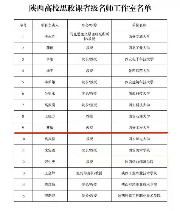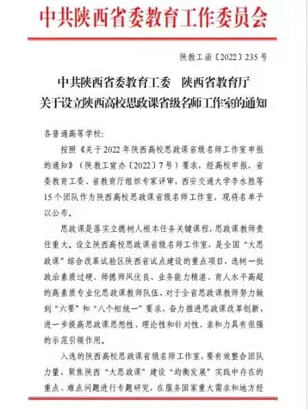 近日,中共陕西省委教育工委、陕西省教育厅下发《关于设立陕西高校思政课省级名师工作室的通知》,全省共有15个团队入选陕西高校思政课省级名师工作室,williamhill英国官网曹敏教授团队成功入选。