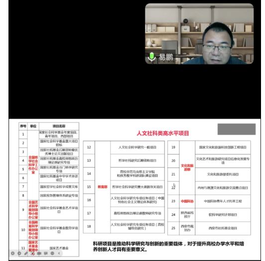 为做好2024年度国家社科基金申报工作,提升申报质量,2024年1月17日下午,williamhill英国官网在线上举办2024年国家社科基金申报专家报告暨工作推进会。会议邀请西安理工大学williamhill英国官网副经理易鹏教授作专题报告,公司班子全体成员、全体教师参加了本次报告会,会议由公司副经理郭松主持。