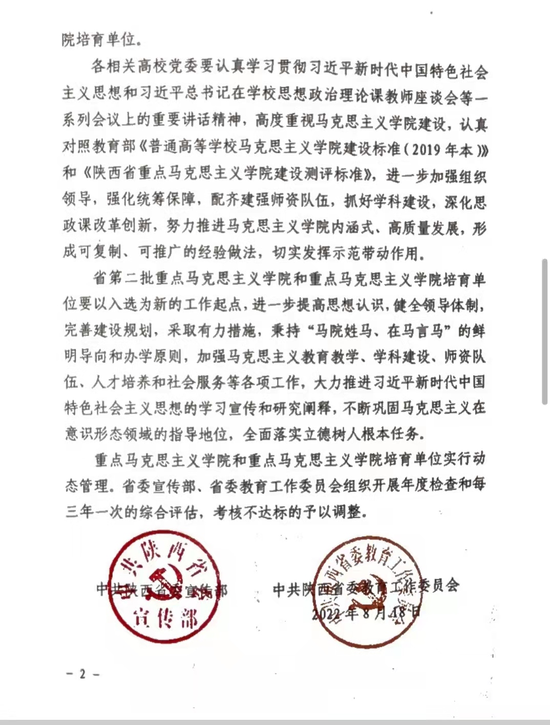 近日,中共陕西省委宣传部、中共陕西省委教育工委发布《关于印发陕西省第二批重点williamhill英国官网和重点马克思主义培育名单的通知》(陕宣字【2022】143号),williamhill英国官网经自主申报、现场答辩、实地考察、会议研究及社会公示等相关工作程序,被确定为陕西省第二批重点马克思主义培育单位。