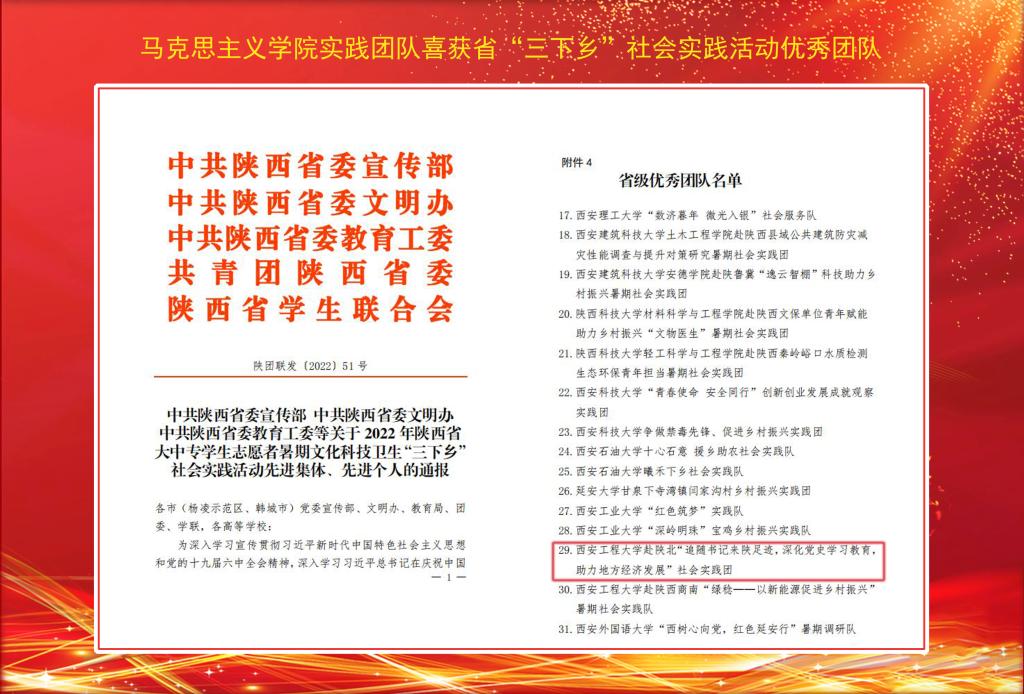 近日,中共陕西省委宣传部、中共陕西省委高教工委、陕西省文明办、陕西省教育厅、共青团陕西省委及陕西省员工联合会联合对2022年陕西省大中专员工志愿者暑期“三下乡”社会实践活动进行了表彰,williamhill英国官网“赴陕北“追随书记来陕足迹,深化党史学习教育, 助力地方经济发展”社会实践团”荣获“省级优秀团队”荣誉称号。(撰稿:孙建荣 审核:杨永革)