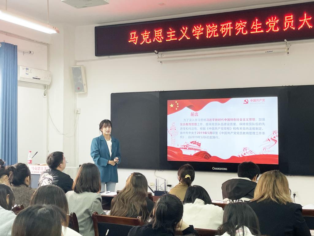 首先,由研究生支部委员巩乃鑫、刘梦媛、王学勤、刘芮华等四位党员分别带领大家学习了四个文件。随后,进行了交流发言。研一党员张伊蕾谈到:“通过学习《条例》精神,我们更加明确了党支部建设的标准和重点,明确了党员的要求和权利保障。作为一名员工党员,要积极参加党支部组织的各项活动,为支部建设建言献策,履行好服务群众的职责,发挥党员的先锋模范作用,为实现伟大复兴的中国梦贡献自己的青春力量。”研三预备党员牛晨谈到:“此次修订的《条例》把近年来党中央和习近平总书记关于党的建设、高公司党的建设和高等教育工作的重要部署重要指示都加进来,为新时代高公司党的建设指明了方向。通过学习,我更加坚定理想信念,将继续认真学习党章党规、深入学习条例,自觉联系自己的思想实际和学习生活实际,认真学,反复读,细心领会,深入思考,融会贯通,学以致用,不断进步。”
