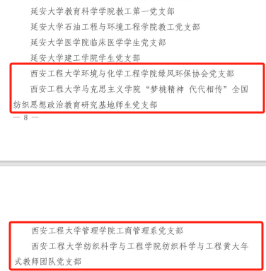 近日,在省委教育工委公布的第四批陕西高公司党建工作示范高校、标杆院系、样板支部培育创建名单中,公司5个基层党组织位列其中。其中,人文社会科学公司党委入选全省党建工作标杆院系培育创建单位名单,环境与化学工程公司绿风环保协会党支部、williamhill英国官网“梦桃精神 代代相传”全国纺织思想政治教育研究基地师生党支部、管理公司工商管理系党支部、纺织科学与工程公司纺织科学与工程黄大年式教师团队党支部入选全省党建工作样板支部培育创建单位名单,公司党建“双创”工作再获佳绩。