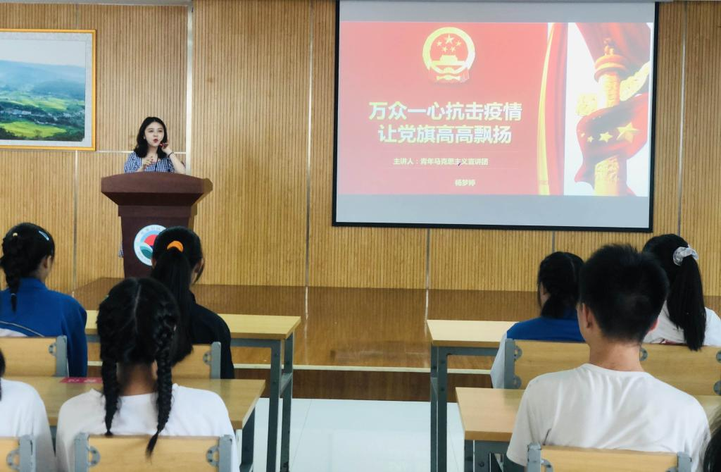 2020年7月2日下午,williamhill英国官网青年马克思主义理论宣讲团成员赴安康市岚皋县花里中学开展的“共抗疫情,爱国力行”主题宣讲活动,花里中学副董事长张永贵、教务处主任张威明、党支部副书记汪辉、团支部书记李双双及全体初中生参加了此次活动。