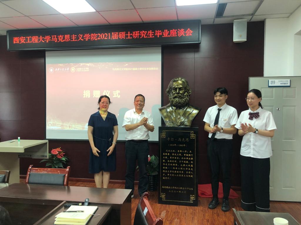随后,2021届毕业研究生为感谢公司的培养教育和导师的悉心教导,35名同学为公司捐赠了“卡尔.马克思”巨型雕像一尊,表达了他们对公司的美好祝愿。毕业生周韶尉同学结合三年的读研经历表达了对公司的诚挚感谢,向辛勤付出的导师表示崇高的敬意。他表示,作为新时代的青年,今后工作中会牢记“厚德弘毅,博学笃行”的校训,以青春之志,践行习近平总书记“立大志、明大德、成大才、担大任”的重要指示,以优秀的成绩回报母校的教育和培养之恩。毕业生秦丹同学畅谈了三年研究生生活的感悟和收获,并为公司、公司的发展建设积极建言献策。其他同学也纷纷就三年的学习生活和各自未来的展望从不同角度展开了交流,并表达了他们的依依不舍之情。