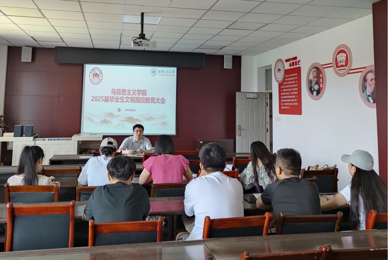 随后开展毕业生文明离校教育。梁育号召广大毕业生以健康文明的方式告别母校,党员和员工干部充分发挥骨干作用,站好最后一班岗,带头营造文明健康的毕业氛围。离校期间要增强纪律意识、安全意识和文明意识,做到不酗酒、不喧哗、不违纪,自觉维护校园良好环境,以文明有序的状态告别母校。最后梁育对党团关系转接、档案转递、图书归还、毕业典礼及稳定安全等重要事项进行了详细说明,确保每位毕业生都能顺利、平稳、安心地完成各项手续,走好从校园迈向社会的“最后一公里”。