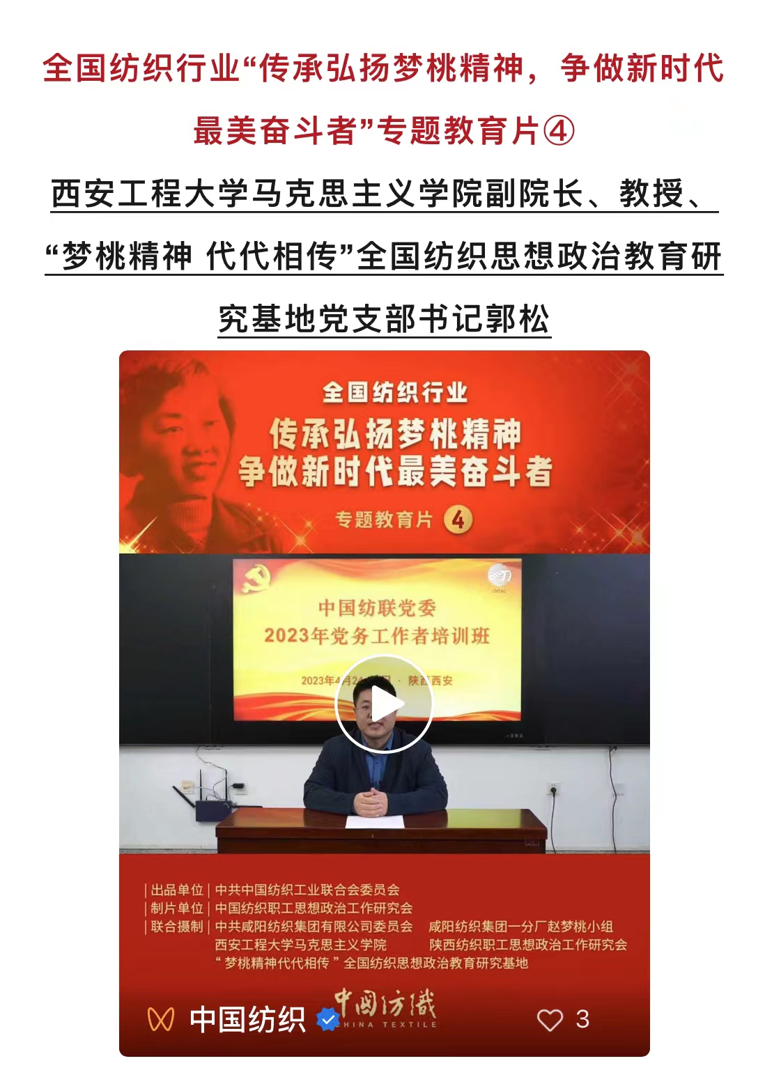 2020年11月,在全国纺织行业创新型班组工作经验交流会上,中国纺织工业联合会为公司“梦桃精神 代代相传”全国纺织思想政治教育研究基地授牌。研究基地结合行业特色与优势,开展了以“梦桃精神”引领实践育人的系列工作。深入走访“赵梦桃小组”的历任组长和老同事,搜集和挖掘第一手资料;组织研究人员围绕“梦桃精神”从历史维度、逻辑维度、时代维度和思想政治教育维度等四个方面开展学术研究;获批省部级等各类“梦桃精神”研究课题多项,在党报党刊、学术期刊等发表“梦桃精神”研究论文10余篇。研究成果荣获中国思想政治工作研究会优秀研究成果奖、中国纺织职工思想政治工作研究会(院校学组)论文一等奖、二等奖等多项。研究基地将研究成果积极融入公司“大思政课”建设中,通过课堂教学、实践教学等途径,聚焦立德树人根本任务,铸魂育人;通过师生理论宣讲团在基层党员、干部和群众中开展“梦桃精神”的宣讲,进一步提升了“梦桃精神”的社会影响力。