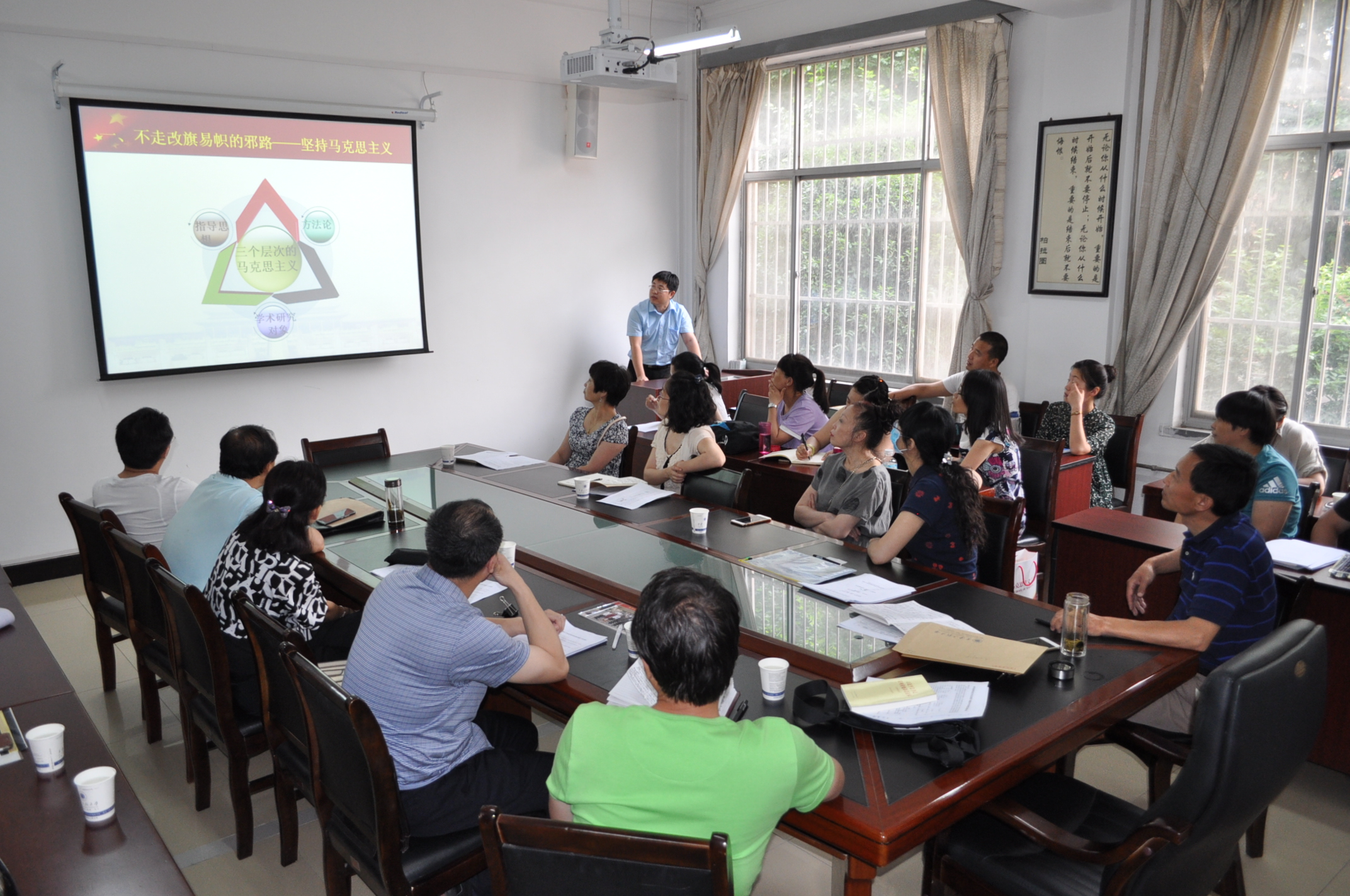会上,郭松老师从解放思想、实事求是、与时俱进、求真务实等四个方面对《如何坚持中国特色社会主义道路?》课程进行了30分钟的完整示范教学,并结合案例向在座青年教师进行了课程呈现,得到了在座教师的一致好评。公司教学督导组老师分别从教学内容的设计、教学方法的使用、教学手段的多样化、基层教学活动开展的重要性以及如何提高员工听课的兴趣等方面与青年教师展开了指导和交流。青年教师们普遍反映受益颇多。