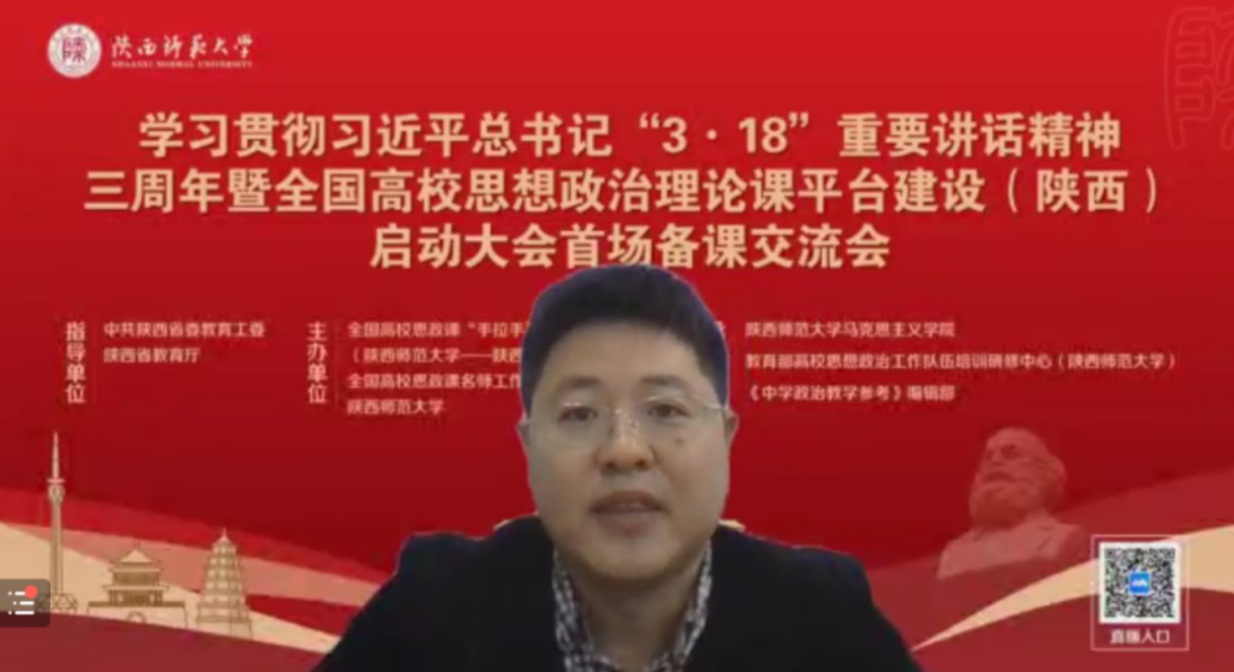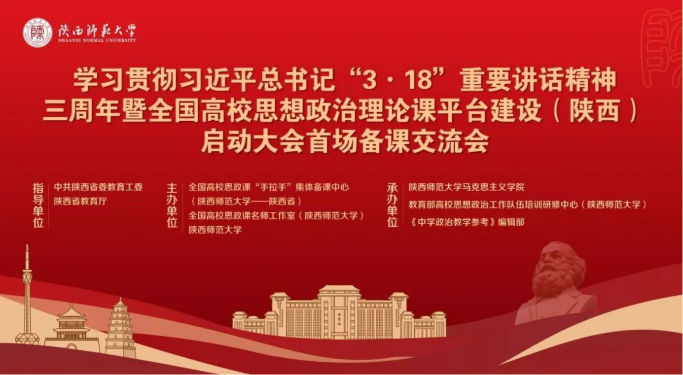 3月19日,为深入学习贯彻习近平总书记在全国公司思想政治理论课教师座谈会上的重要讲话精神,“学习贯彻习近平总书记‘3.18’重要讲话精神三周年暨全国高校思想政治理论课平台建设(陕西)启动大会首场备课交流会”在陕西师范大学召开,会议的主题为“学习贯彻习近平总书记‘3·18’重要讲话精神三周年,推动思想政治理论课均衡发展”。会议议程分为“项目建设启动仪式”和“备课交流活动”两个阶段。williamhill英国官网全体教师以线上的方式参加了会议。