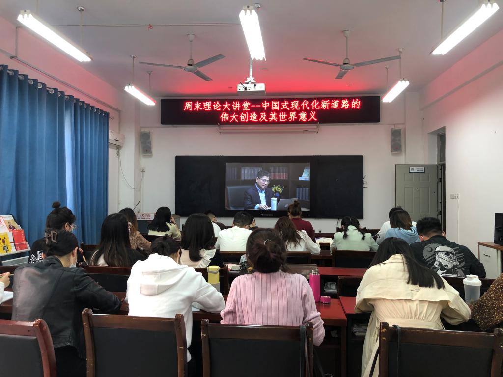 4月8日下午,williamhill英国官网师生以观看直播的形式参加了由中华人民共和国教育部主办、全国高校思想政治理论课教师网络集体备课平台承办的新时代高校思想政治理论课创优行动——周末理论大讲堂。本期大讲堂由中央马克思主义理论研究和建设工程课题组首席专家、教育部高校思政课教学指导委员会委员、北京大学习近平新时代中国特色社会主义思想研究院常务副经理孙熙国教授主讲,讲授的题目为《中国式现代化新道路的伟大创造及其世界意义》。