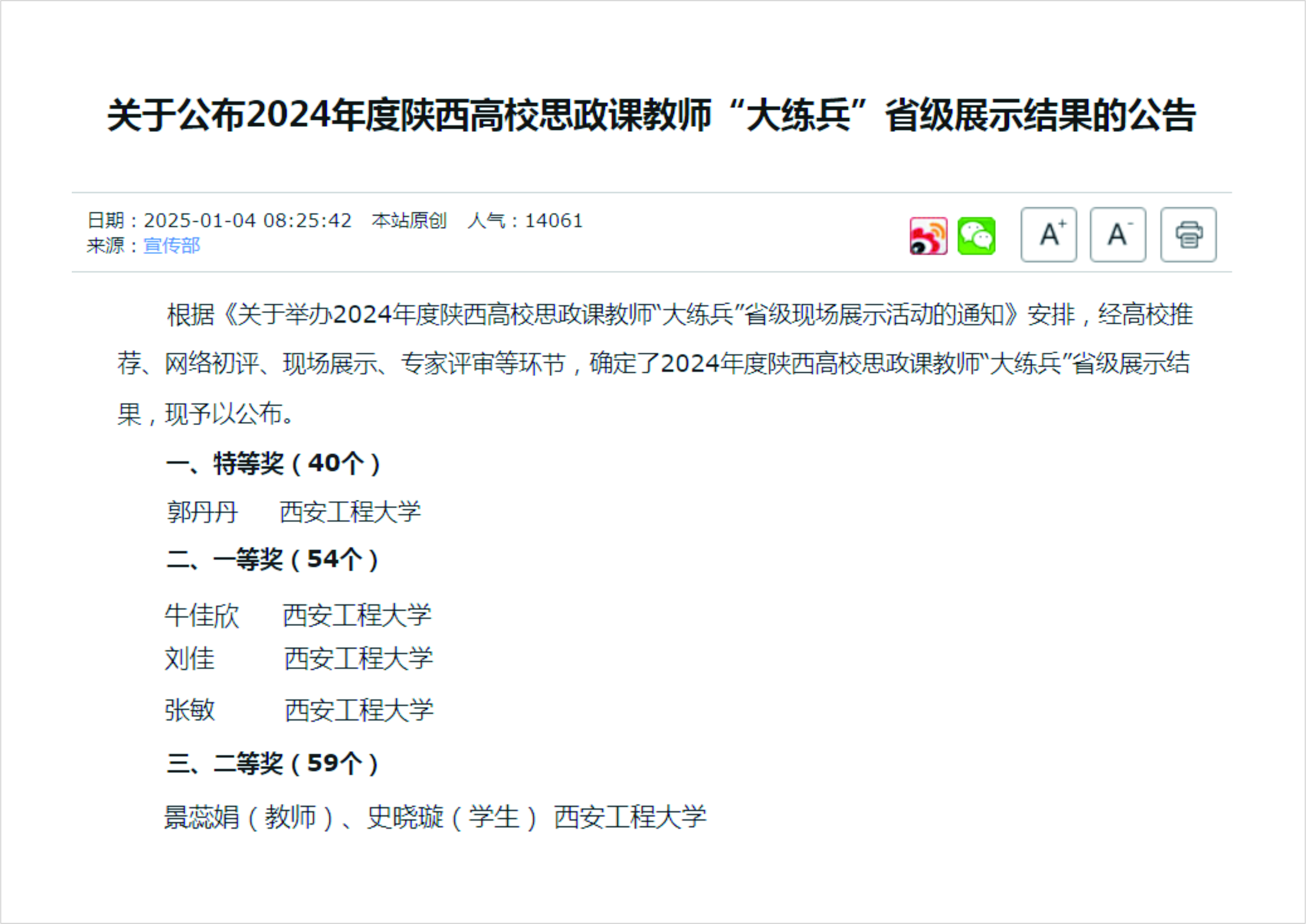 2025年1月4日,中共陕西省委教育工委、陕西省教育厅公布2024年度陕西高校思政课教师“大练兵”省级展示结果。williamhill英国官网5位教师取得优异成绩,其中郭丹丹获特等奖,张敏、牛佳欣、刘佳获一等奖,景蕊娟及史晓璇(员工)荣获二等奖。获奖人数创历年最多,并列全省第一。